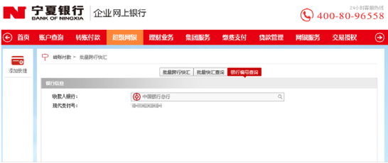 上傳文件內(nèi)的現(xiàn)代支付號(hào),可以在標(biāo)簽頁“銀行編號(hào)查詢”里查到,在下圖頁面里首先選擇收款銀行,在下面彈出的網(wǎng)點(diǎn)下拉框里選中網(wǎng)點(diǎn),最下方會(huì)自動(dòng)彈出所選銀行的現(xiàn)代支付號(hào)。