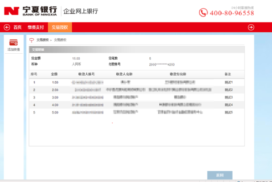 6、用企業(yè)審核員用戶登錄網(wǎng)銀系統(tǒng),進(jìn)入菜單“交易授權(quán)->交易授權(quán)”,點(diǎn)擊交易類型為“批量轉(zhuǎn)賬”記錄的最后列“交易詳細(xì)信息”,查看交易詳細(xì)信息,然后點(diǎn)擊“返回”;勾選待審核的記錄,在PIN密碼框里輸入證書密碼,點(diǎn)擊按鈕“同意”,即審核同意。